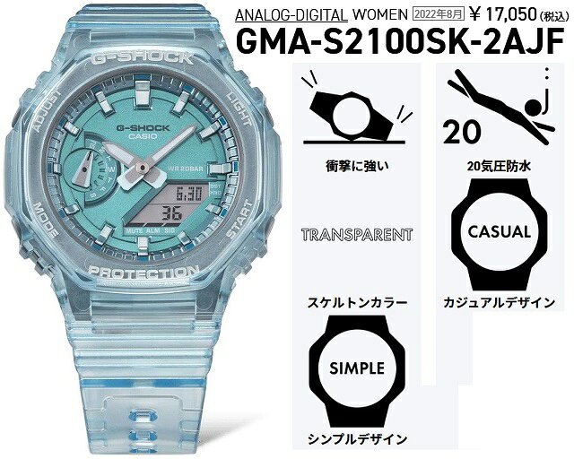 クリアグレー◆GMA-S2100SK-1AJF◆ クリアピンク◆GMA-S2100SK-4AJF◆ クリアホワイト◆GMA-S2100SK-7AJF◆ メーカー希望小売価格はメーカー商品タグに基づいて掲載していますG-SHOCK S-line METALLIC SKELETON GMA-S2100SK-2AJF 品番 GMA-S2100SK-2AJF [Cal:5611]【正規品】メーカー保証:1年 ●「落としても壊れない丈夫な時計を作りたい」という開発者の思いから、1983年に耐衝撃構造を備えた初代モデルが誕生して以来、[Absolute Toughness]というコンセプトを貫きながら、タフネスを追求し常に進化を続ける【CASIO G-SHOCK/カシオ ジーショック】から、タフな構造はそのままに、無駄を省いたシンプルで薄型の[オクタゴン/八角形]デザインが人気のデジタル・アナログコンビ=[GA-2100]をダウンサイジングさせたモデルの、NEWカラーコレクションが登場!! ●ベースモデルの[GA-2100]はG-SHOCKの初代モデル[DW-5000C]の八角形フォルムを継承し薄型化したモデルで、フラットなフェイスとシンプルなバーインデックスがシンプルながらもソリッドな印象に演出しており、[カシオーク]のニックネームで世界的な人気を博しています☆