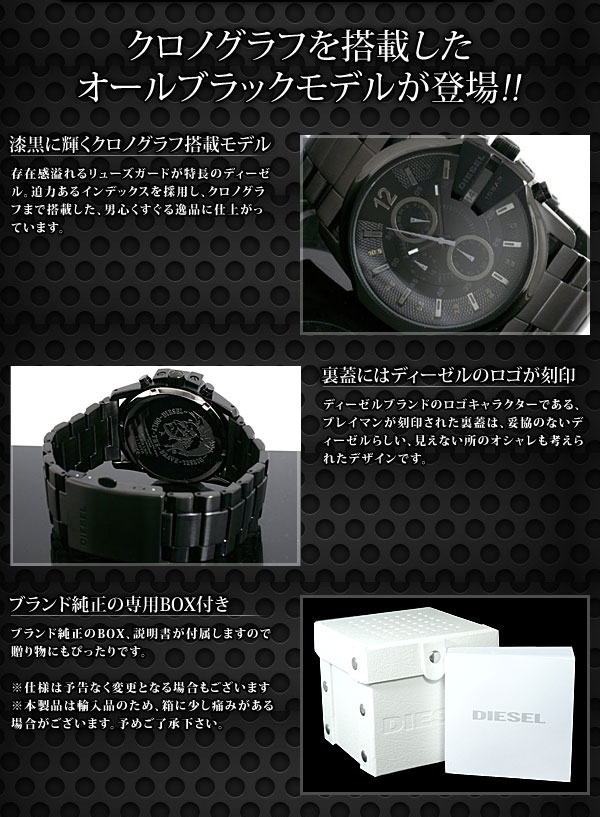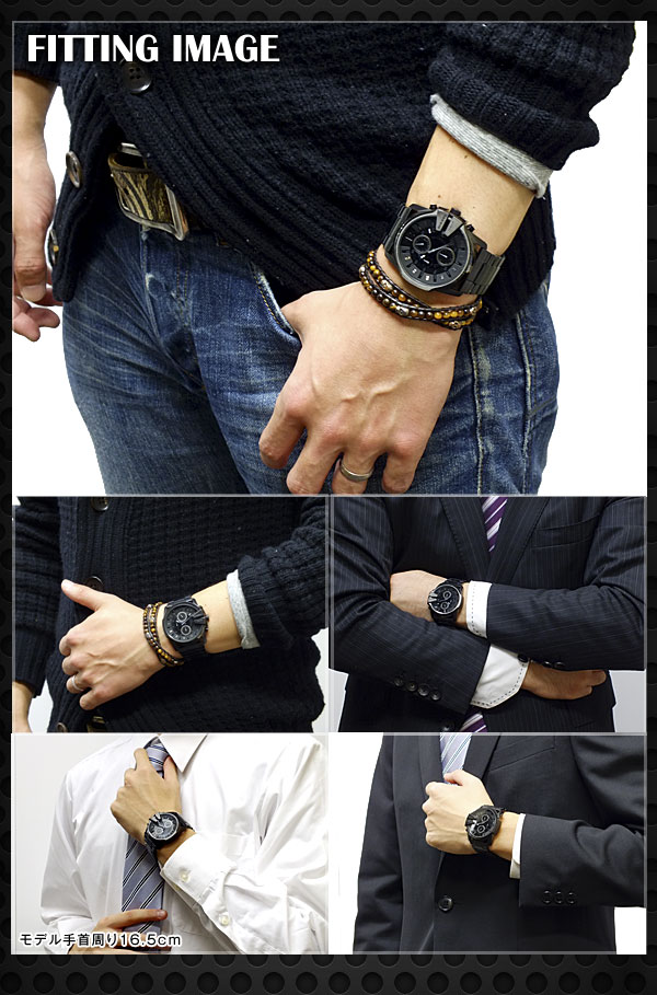 Item Informationサイズ(約)H46×W44×D12mm(ラグ、リュウズ除く)、重さ(約)180g、腕周り最大(約)19.5cm、腕周り最少(約)14.5cm、ベルト幅ラグ付近(約)26cm、ベルト幅バックル付近(約)24cm仕様クオーツ、クロノグラフ、24時間計、10気圧防水、カレンダー(日付)付属品DIESEL専用ケース、取扱説明書、保証書