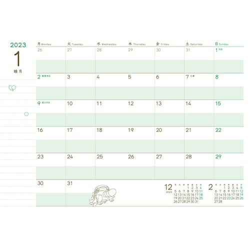 [10月始まり](80ページ)サイズ:(外形)約150x215x8mm/(本文)約145x210mm(A5サイズ)年間カレンダー/年間スケジュール/マンスリー(2022.10-2024.1)/横罫メモ/罫無しメモ/切り取りメモ/アドレス帳/年齢早見表/パーソナルメモカラー/グリーン系(緑)このカテゴリにはこんな商品が含まれています【月間手帳:A5サイズ】/スケジュール帳マンスリーA5/手帳A6月間/A6手帳月間これを見た人はこんなキーワードで検索しています月間 手帳マンスリー 手帳手帳 A5月間タイプ月間ダイアリーダイアリースケジュール帳ノートメモ帳日記帳